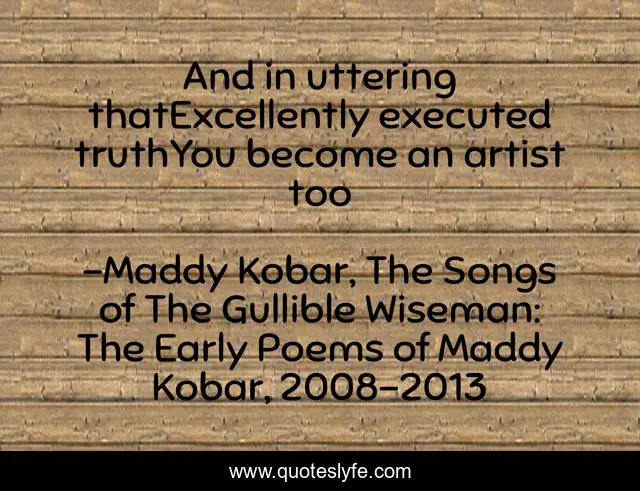 This page presents the quote "And in uttering thatExcellently executed truthYou become an artist too". Author of this quote is Maddy Kobar, The Songs of The Gullible Wiseman: The Early Poems of Maddy Kobar, 2008-2013. This quote is about artists, poetry, observations,.