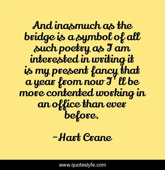 This page presents the quote "And inasmuch as the bridge is a symbol of all such poetry as I am interested in writing it is my present fancy that a year from now I'll be more contented working in an office than ever before.". Author of this quote is Hart Crane. This quote is about bridge, writing,.