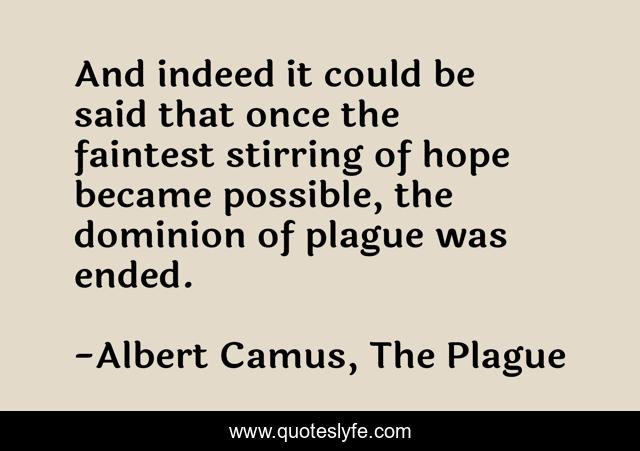 This page presents the quote "And indeed it could be said that once the faintest stirring of hope became possible, the dominion of plague was ended.". Author of this quote is Albert Camus, The Plague. .