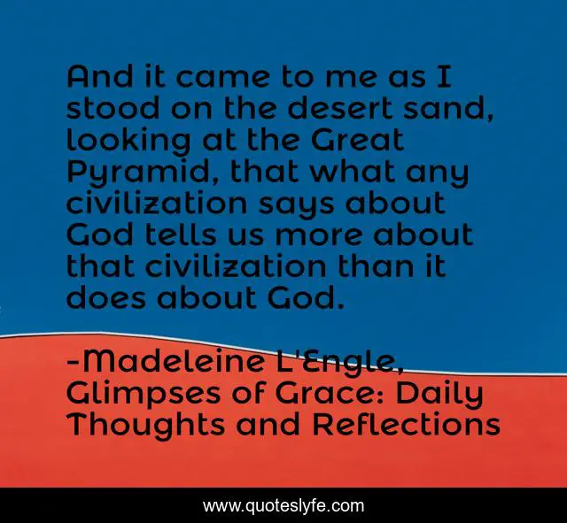 This page presents the quote "And it came to me as I stood on the desert sand, looking at the Great Pyramid, that what any civilization says about God tells us more about that civilization than it does about God.". Author of this quote is Madeleine L'Engle, Glimpses of Grace: Daily Thoughts and Reflections. This quote is about faith, civilization, god,.
