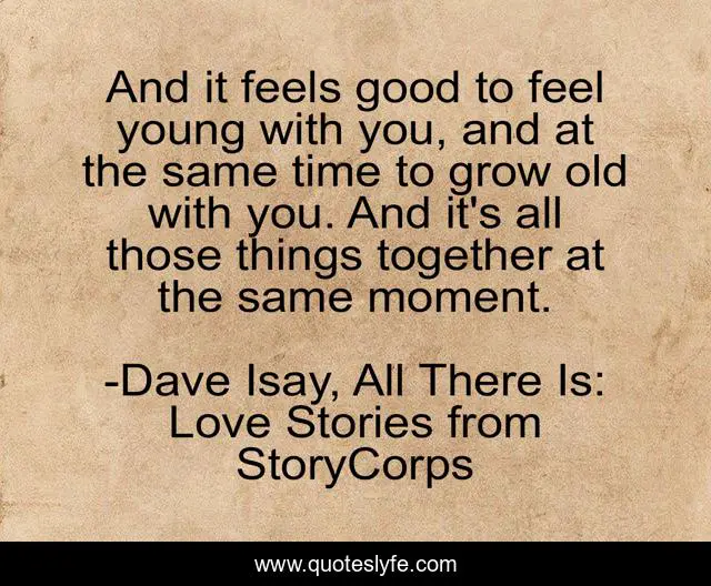 This page presents the quote "And it feels good to feel young with you, and at the same time to grow old with you. And it's all those things together at the same moment.". Author of this quote is Dave Isay, All There Is: Love Stories from StoryCorps. This quote is about love, marriage, affection,.