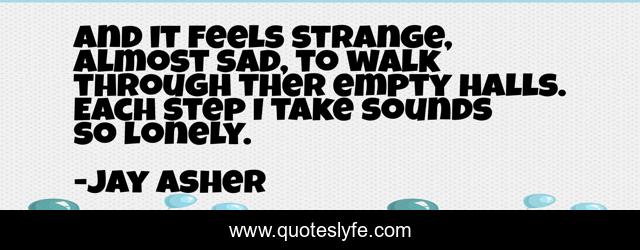 This page presents the quote "And it feels strange, almost sad, to walk through ther empty halls. Each step I take sounds so lonely.". Author of this quote is Jay Asher. This quote is about loneliness, suicide, sadness,.