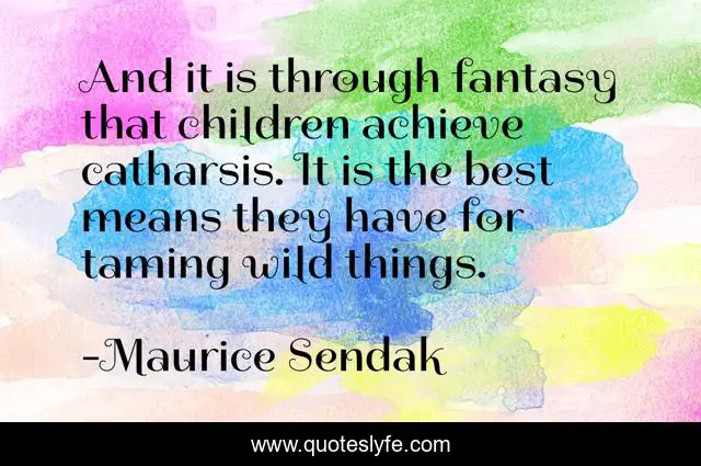 This page presents the quote "And it is through fantasy that children achieve catharsis. It is the best means they have for taming wild things.". Author of this quote is Maurice Sendak. This quote is about fantasy, wild-things,.