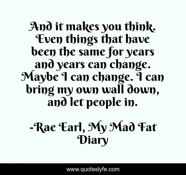 This page presents the quote "And it makes you think. Even things that have been the same for years and years can change. Maybe I can change. I can bring my own wall down, and let people in.". Author of this quote is Rae Earl, My Mad Fat Diary. .