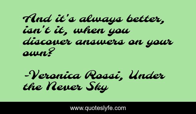 This page presents the quote "And it's always better, isn't it, when you discover answers on your own?". Author of this quote is Veronica Rossi, Under the Never Sky. This quote is about existentialism, guidance, young-adult, inspirational, enthusiasm,.