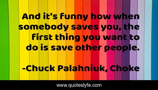 This page presents the quote "And it's funny how when somebody saves you, the first thing you want to do is save other people.". Author of this quote is Chuck Palahniuk, Choke. This quote is about hero, heroism, saving,.