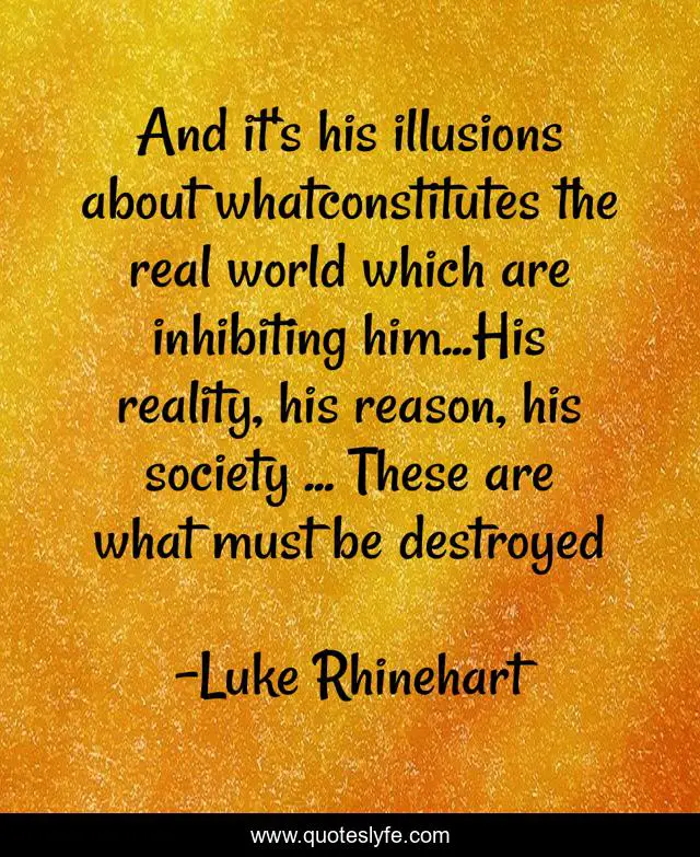 This page presents the quote "And it's his illusions about whatconstitutes the real world which are inhibiting him...His reality, his reason, his society ... These are what must be destroyed". Author of this quote is Luke Rhinehart. This quote is about illusions, real-world, reality, destroyed, society, reason,.