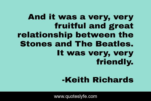This page presents the quote "And it was a very, very fruitful and great relationship between the Stones and The Beatles. It was very, very friendly.". Author of this quote is Keith Richards. This quote is about stones, great, between,.