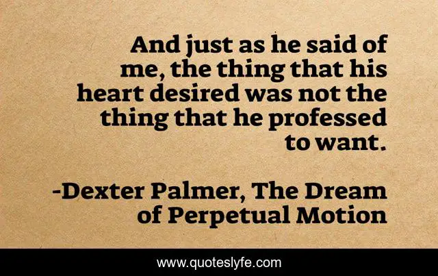 This page presents the quote "And just as he said of me, the thing that his heart desired was not the thing that he professed to want.". Author of this quote is Dexter Palmer, The Dream of Perpetual Motion. This quote is about the-dream-of-perpetual-motion, heart, dexter-palmer, heart-s-desired,.