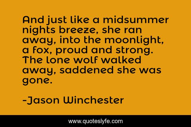 This page presents the quote "And just like a midsummer nights breeze, she ran away, into the moonlight, a fox, proud and strong. The lone wolf walked away, saddened she was gone.". Author of this quote is Jason Winchester. This quote is about summer, winter, spring, proud, fox, i-wrote-this-for-you, iain-thomas, wolf, fall,.
