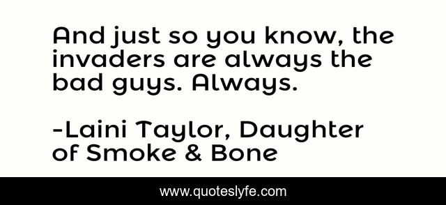 This page presents the quote "And just so you know, the invaders are always the bad guys. Always.". Author of this quote is Laini Taylor, Daughter of Smoke & Bone. This quote is about invaders, war, bad-guys,.