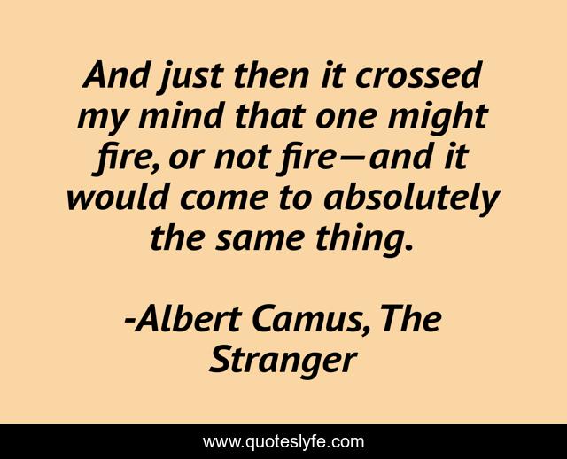 This page presents the quote "And just then it crossed my mind that one might fire, or not fire—and it would come to absolutely the same thing.". Author of this quote is Albert Camus, The Stranger. .