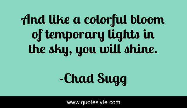This page presents the quote "And like a colorful bloom of temporary lights in the sky, you will shine.". Author of this quote is Chad Sugg. This quote is about shine, life, inspire, colorful, sky, lights, inspirational, enthusiasm,.