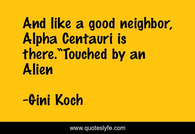 This page presents the quote "And like a good neighbor, Alpha Centauri is there.”Touched by an Alien". Author of this quote is Gini Koch. This quote is about aliens, humor, touched-by-an-alien, science-fiction,.