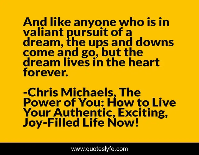 This page presents the quote "And like anyone who is in valiant pursuit of a dream, the ups and downs come and go, but the dream lives in the heart forever.". Author of this quote is Chris Michaels, The Power of You: How to Live Your Authentic, Exciting, Joy-Filled Life Now!. This quote is about inspiring, inspirational, the-power-of-now, the-power-of-the-mind, inspirational-life, enthusiasm,.