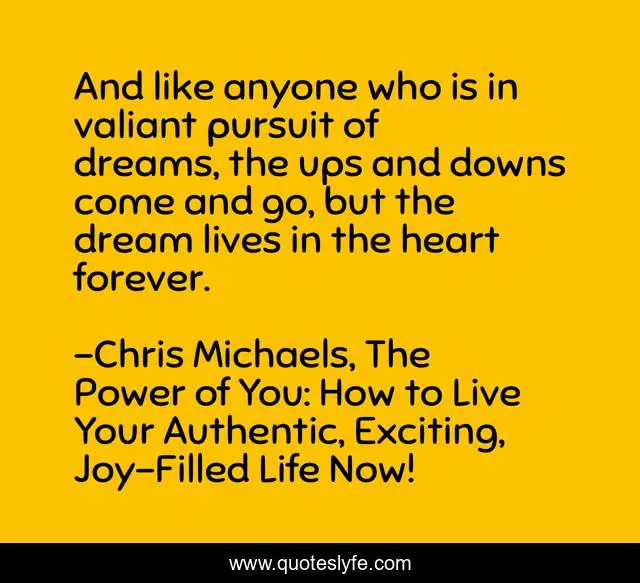 This page presents the quote "And like anyone who is in valiant pursuit of dreams, the ups and downs come and go, but the dream lives in the heart forever.". Author of this quote is Chris Michaels, The Power of You: How to Live Your Authentic, Exciting, Joy-Filled Life Now!. This quote is about enthusiasm, happiness, inspirational, the-power-of-your-mind, self-help,.