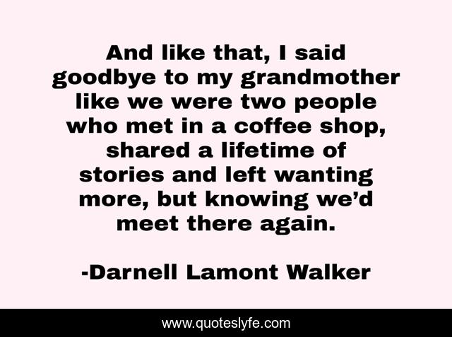This page presents the quote "And like that, I said goodbye to my grandmother like we were two people who met in a coffee shop, shared a lifetime of stories and left wanting more, but knowing we’d meet there again.". Author of this quote is Darnell Lamont Walker. This quote is about grandmother, sorrow, death, family,.