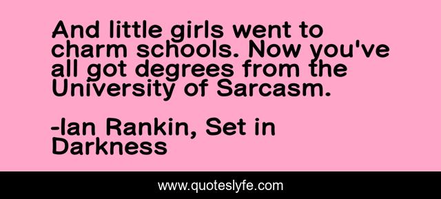 This page presents the quote "And little girls went to charm schools. Now you've all got degrees from the University of Sarcasm.". Author of this quote is Ian Rankin, Set in Darkness. This quote is about set-in-darkness, sarcasm, university, girls, feminism, women,.