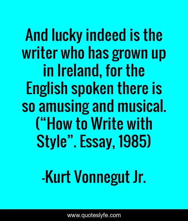 This page presents the quote "And lucky indeed is the writer who has grown up in Ireland, for the English spoken there is so amusing and musical. (“How to Write with Style”. Essay, 1985)". Author of this quote is Kurt Vonnegut Jr.. This quote is about style, writer, writers, ireland, writing,.