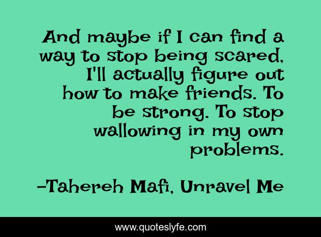 This page presents the quote "And maybe if I can find a way to stop being scared, I'll actually figure out how to make friends. To be strong. To stop wallowing in my own problems.". Author of this quote is Tahereh Mafi, Unravel Me. This quote is about teen, life, fears, problems-in-life,.