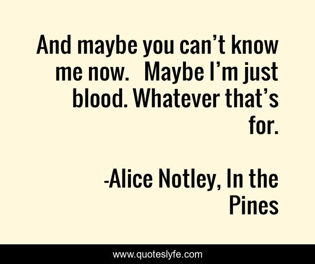 This page presents the quote "And maybe you can’t know me now. Maybe I’m just blood. Whatever that’s for.". Author of this quote is Alice Notley, In the Pines. This quote is about in-the-pines, blood, alice-notley,.