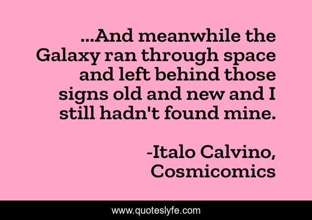 This page presents the quote "...And meanwhile the Galaxy ran through space and left behind those signs old and new and I still hadn't found mine.". Author of this quote is Italo Calvino, Cosmicomics. This quote is about space, time, mark, signs, existential, galaxy,.