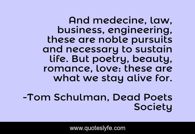 This page presents the quote "And medecine, law, business, engineering, these are noble pursuits and necessary to sustain life. But poetry, beauty, romance, love: these are what we stay alive for.". Author of this quote is Tom Schulman, Dead Poets Society. This quote is about beauty, love, poetry, affection,.