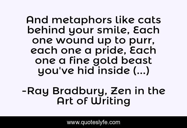 "Ray Bradbury, Zen in the Art of Writing Quotes." Quoteslyfe.com, 2025. Sat. 06 Dec. 2025. <https://www.quoteslyfe.com/quote/And-metaphors-like-cats-behind-your-smile-186254>.
