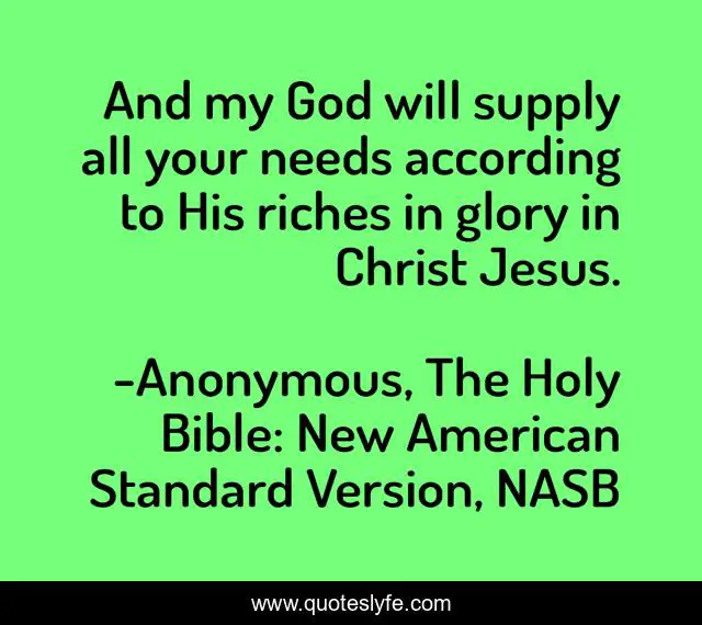 This page presents the quote "And my God will supply all your needs according to His riches in glory in Christ Jesus.". Author of this quote is Anonymous, The Holy Bible: New American Standard Version, NASB. This quote is about jesus-christ, faith, bible, god,.