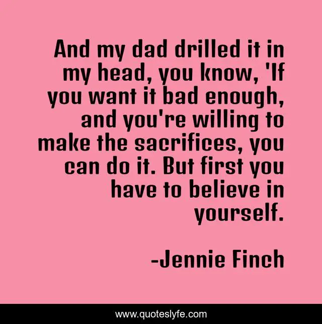 This page presents the quote "And my dad drilled it in my head, you know, 'If you want it bad enough, and you're willing to make the sacrifices, you can do it. But first you have to believe in yourself.". Author of this quote is Jennie Finch. .