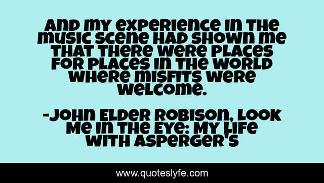 This page presents the quote "And my experience in the music scene had shown me that there were places for places in the world where misfits were welcome.". Author of this quote is John Elder Robison, Look Me in the Eye: My Life with Asperger's. This quote is about music, psychology,.