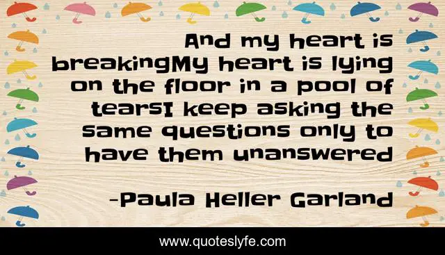 This page presents the quote "And my heart is breakingMy heart is lying on the floor in a pool of tearsI keep asking the same questions only to have them unanswered". Author of this quote is Paula Heller Garland. .