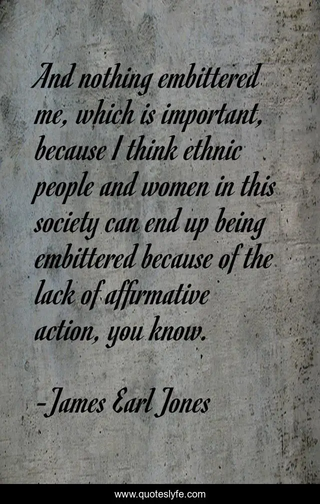 This page presents the quote "And nothing embittered me, which is important, because I think ethnic people and women in this society can end up being embittered because of the lack of affirmative action, you know.". Author of this quote is James Earl Jones. This quote is about action, society, me,.
