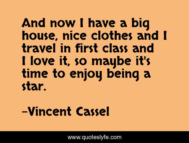 This page presents the quote "And now I have a big house, nice clothes and I travel in first class and I love it, so maybe it's time to enjoy being a star.". Author of this quote is Vincent Cassel. This quote is about enjoy, love, affection, time,.