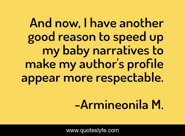This page presents the quote "And now, I have another good reason to speed up my baby narratives to make my author's profile appear more respectable.". Author of this quote is Armineonila M.. This quote is about writing-process, conceptualizing, stream-of-thought,.