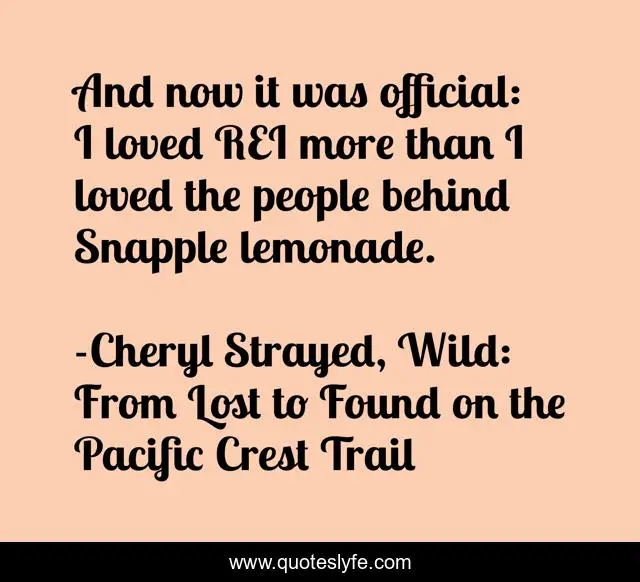 This page presents the quote "And now it was official: I loved REI more than I loved the people behind Snapple lemonade.". Author of this quote is Cheryl Strayed, Wild: From Lost to Found on the Pacific Crest Trail. This quote is about travel, memoir, pct, hiking,.