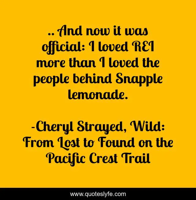 This page presents the quote ".. And now it was official: I loved REI more than I loved the people behind Snapple lemonade.". Author of this quote is Cheryl Strayed, Wild: From Lost to Found on the Pacific Crest Trail. This quote is about hiking, memoir, pct,.