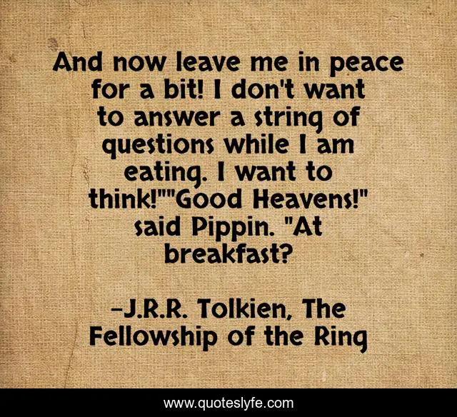 This page presents the quote "And now leave me in peace for a bit! I don't want to answer a string of questions while I am eating. I want to think!""Good Heavens!" said Pippin. "At breakfast?". Author of this quote is J.R.R. Tolkien, The Fellowship of the Ring. This quote is about humorous, breakfast, hobbits,.