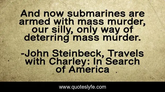 This page presents the quote "And now submarines are armed with mass murder, our silly, only way of deterring mass murder.". Author of this quote is John Steinbeck, Travels with Charley: In Search of America. This quote is about security, violence,.