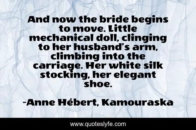 This page presents the quote "And now the bride begins to move. Little mechanical doll, clinging to her husband’s arm, climbing into the carriage. Her white silk stocking, her elegant shoe.". Author of this quote is Anne Hébert, Kamouraska. This quote is about drama, literature, fiction,.
