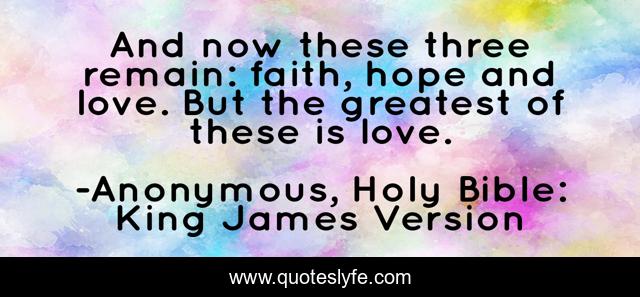 This page presents the quote "And now these three remain: faith, hope and love. But the greatest of these is love.". Author of this quote is Anonymous, Holy Bible: King James Version. This quote is about faith, love, hope, affection, god,.
