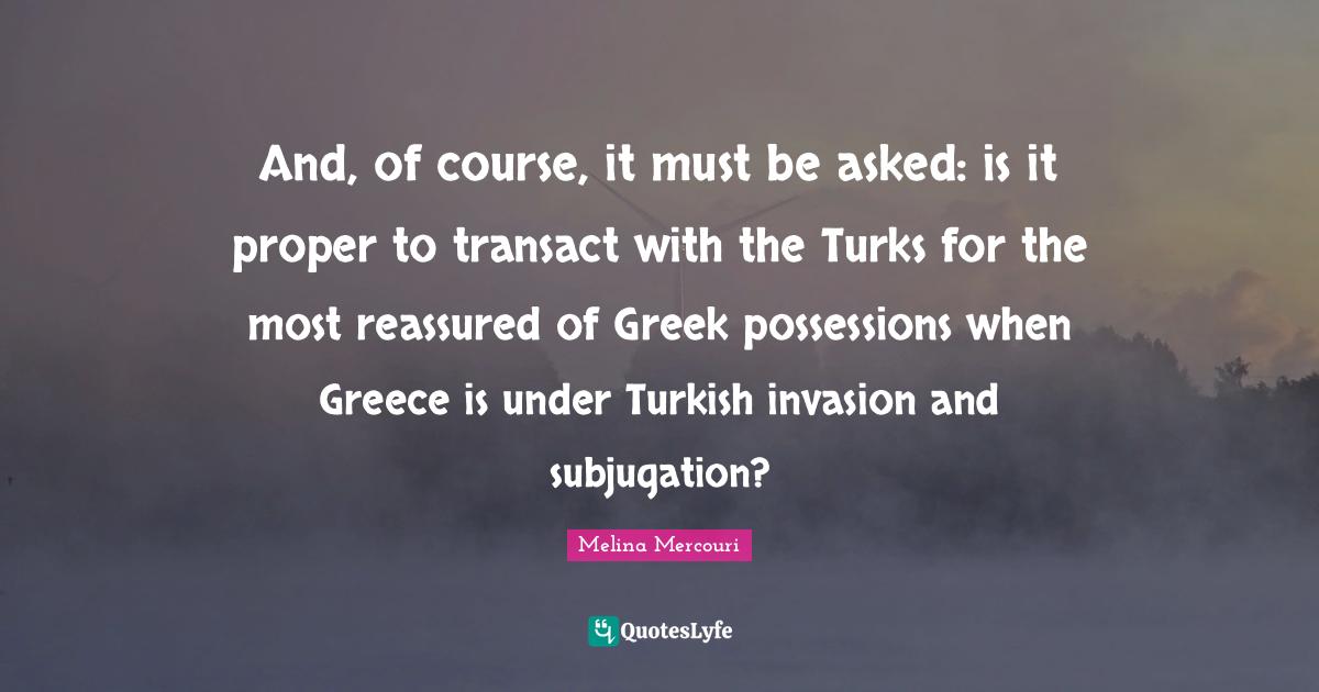 This page presents the quote "And, of course, it must be asked: is it proper to transact with the Turks for the most reassured of Greek possessions when Greece is under Turkish invasion and subjugation?". Author of this quote is Melina Mercouri. This quote is about turkish, subjugation, greece, greek, invasion,.