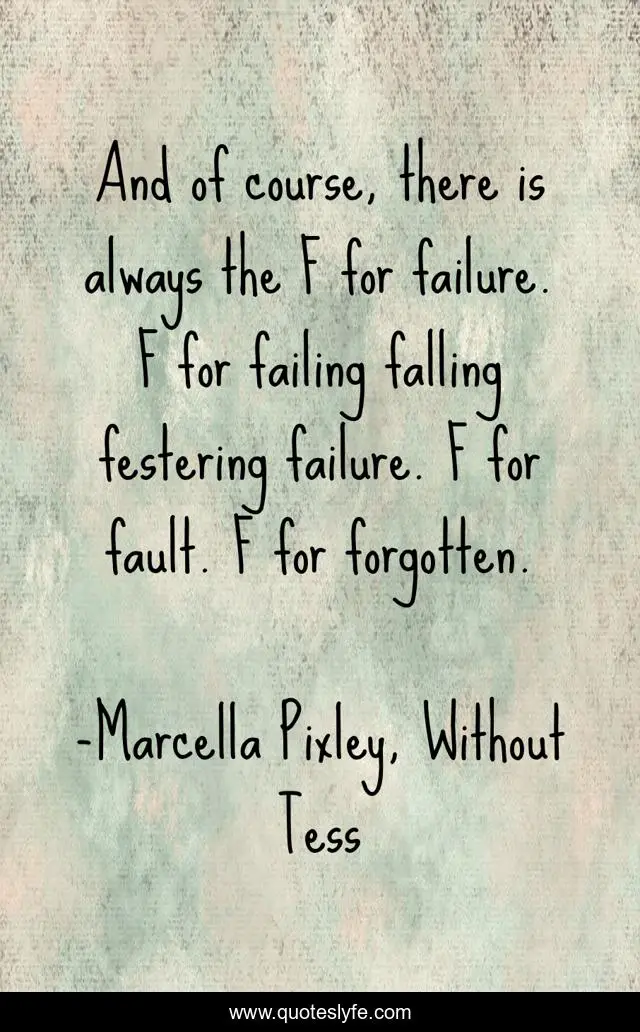 This page presents the quote "And of course, there is always the F for failure. F for failing falling festering failure. F for fault. F for forgotten.". Author of this quote is Marcella Pixley, Without Tess. .