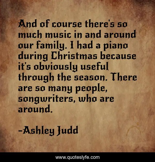 This page presents the quote "And of course there's so much music in and around our family. I had a piano during Christmas because it's obviously useful through the season. There are so many people, songwriters, who are around.". Author of this quote is Ashley Judd. This quote is about music, family, people,.