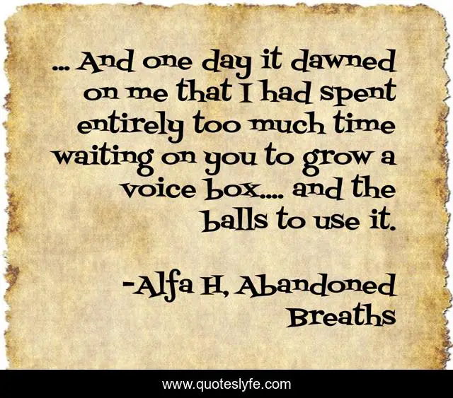 This page presents the quote "... And one day it dawned on me that I had spent entirely too much time waiting on you to grow a voice box.... and the balls to use it.". Author of this quote is Alfa H, Abandoned Breaths. This quote is about emotion, relationships, voice, poetry, truth,.