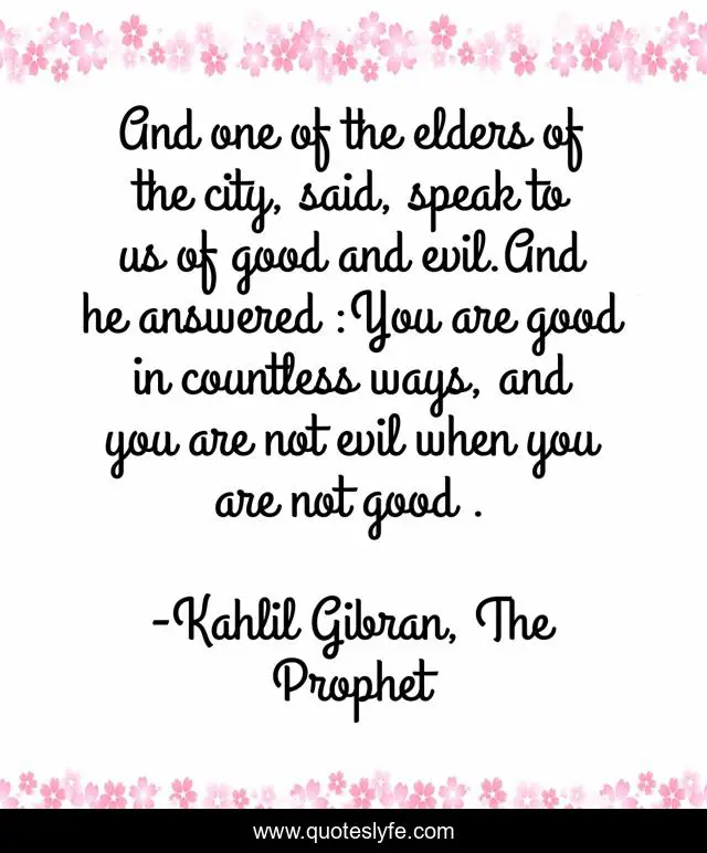 This page presents the quote "And one of the elders of the city, said, speak to us of good and evil.And he answered :You are good in countless ways, and you are not evil when you are not good .". Author of this quote is Kahlil Gibran, The Prophet. .