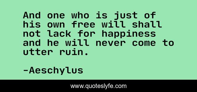 This page presents the quote "And one who is just of his own free will shall not lack for happiness and he will never come to utter ruin.". Author of this quote is Aeschylus. This quote is about free, free will,.