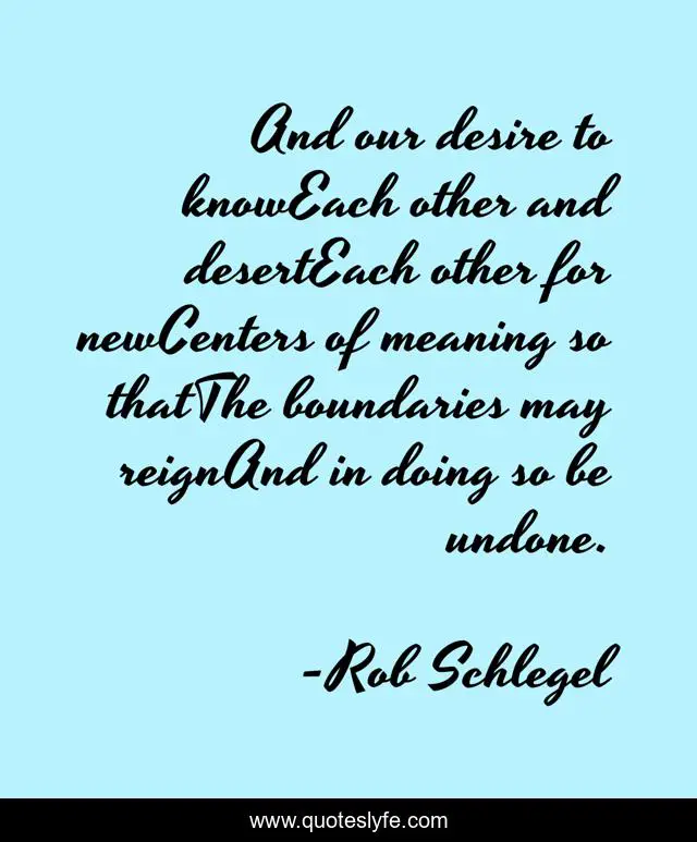This page presents the quote "And our desire to knowEach other and desertEach other for newCenters of meaning so thatThe boundaries may reignAnd in doing so be undone.". Author of this quote is Rob Schlegel. This quote is about desire, boundaries, meaning, undone, desert,.