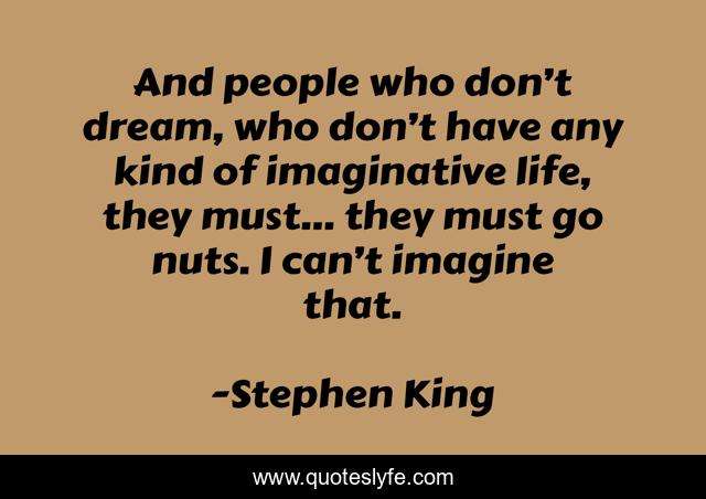 This page presents the quote "And people who don’t dream, who don’t have any kind of imaginative life, they must… they must go nuts. I can’t imagine that.". Author of this quote is Stephen King. This quote is about imagination, dreaming, true, inspirational, enthusiasm,.