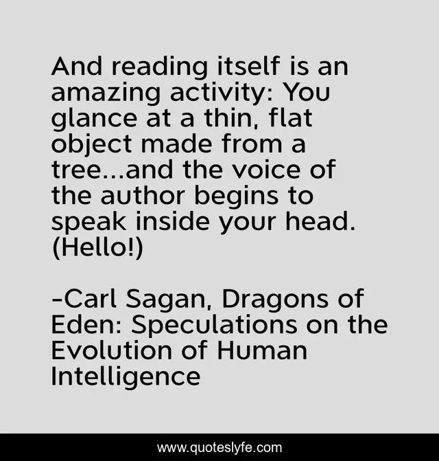 This page presents the quote "And reading itself is an amazing activity: You glance at a thin, flat object made from a tree...and the voice of the author begins to speak inside your head. (Hello!)". Author of this quote is Carl Sagan, Dragons of Eden: Speculations on the Evolution of Human Intelligence. This quote is about reading-books, books, reading,.